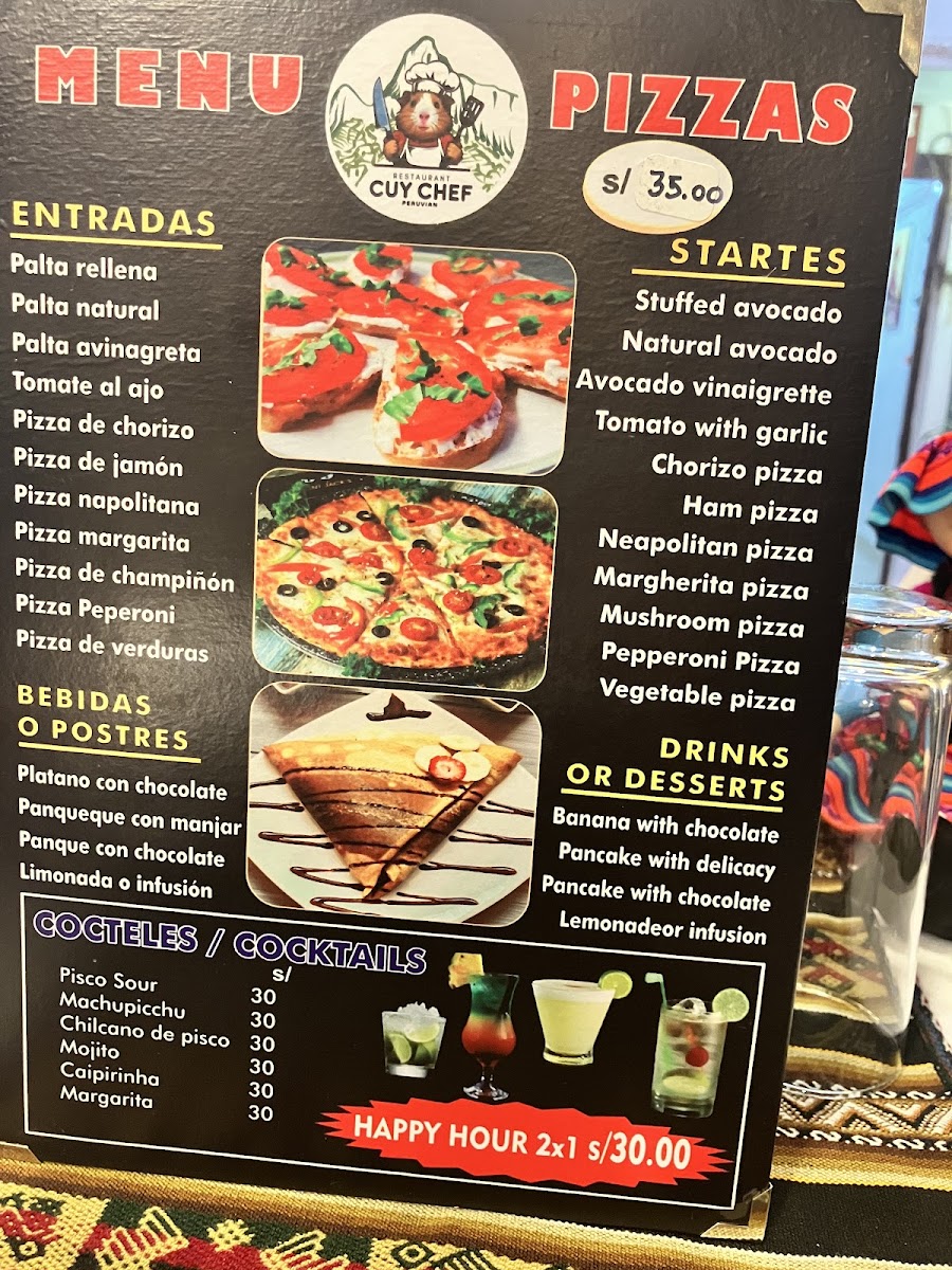 “ If you’re wondering around this area, I really recommend you check out this wonderful pizzeria Kuy Chef. we tried up variety from their menu even some of their Mexican food. I was not expecting to try Mexican food in Peru, but the little taquitos with the guacamole that they had was actually really very good stuffed with cheese and the guacamole was very tasty. We came during happy hour. You can get two for one or three for one if you prefer. Everything was fantastic. The margarita was surprisingly good in Peru. The owner treated us like royalty and she was very kind and very supportive. She made sure that all of our food was to our liking and her drinks that she brought out were phenomenal. I would recommend this place because it’s quaint. It’s right on the main road and the drinks are fantastic. ”